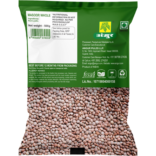 Masoor Whole has various health benefits. It stabilizes sugar and cholesterol levels, promotes weight loss, and also nourishes bone health. Masoor whole is powerhouse of nutrients and when it is Angur Masoor, you don’t need to think twice. It is hygienically processed under controlled supervision. Full-proof modern packaging adds to the freshness and keeps moisture away giving it a longer shelf life.