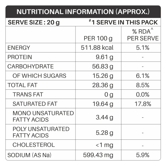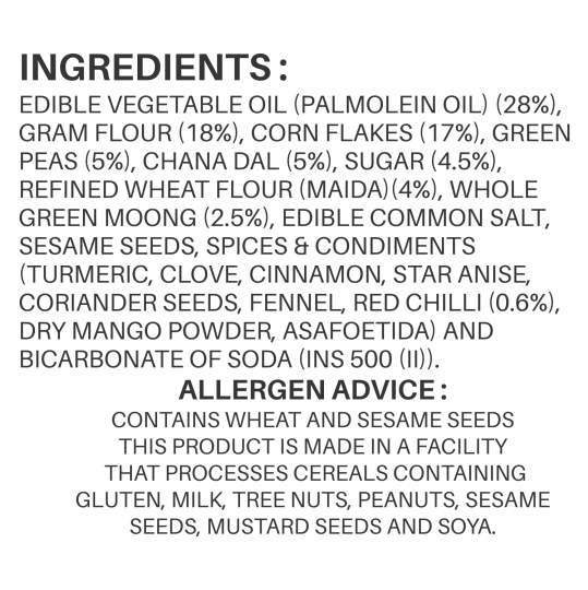 EDIBLE VEGETABLE OIL (PALMOLEIN OIL) (28%), GRAM FLOUR (18%), CORN FLAKES (17%), GREEN PEAS (5%), CHANA DAL (5%), SUGAR (4.5%), REFINED WHEAT FLOUR (MAIDA)(4%), WHOLE GREEN MOONG (2.5%), EDIBLE COMMON SALT, SESAME SEEDS, SPICES & CONDIMENTS (TURMERIC, CLOVE, CINNAMON, STAR ANISE, CORIANDER SEEDS, FENNEL, RED CHILLI (0.6%), DRY MANGO POWDER, ASAFOETIDA) AND BICARBONATE OF SODA (INS 500 (II)).