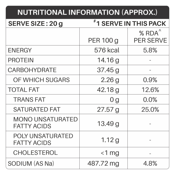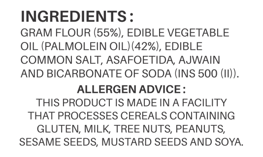 GRAM FLOUR (55%), EDIBLE VEGETABLE OIL (PALMOLEIN OIL)(42%), EDIBLE COMMON SALT, ASAFOETIDA, AJWAIN AND BICARBONATE OF SODA (INS 500 (II)).